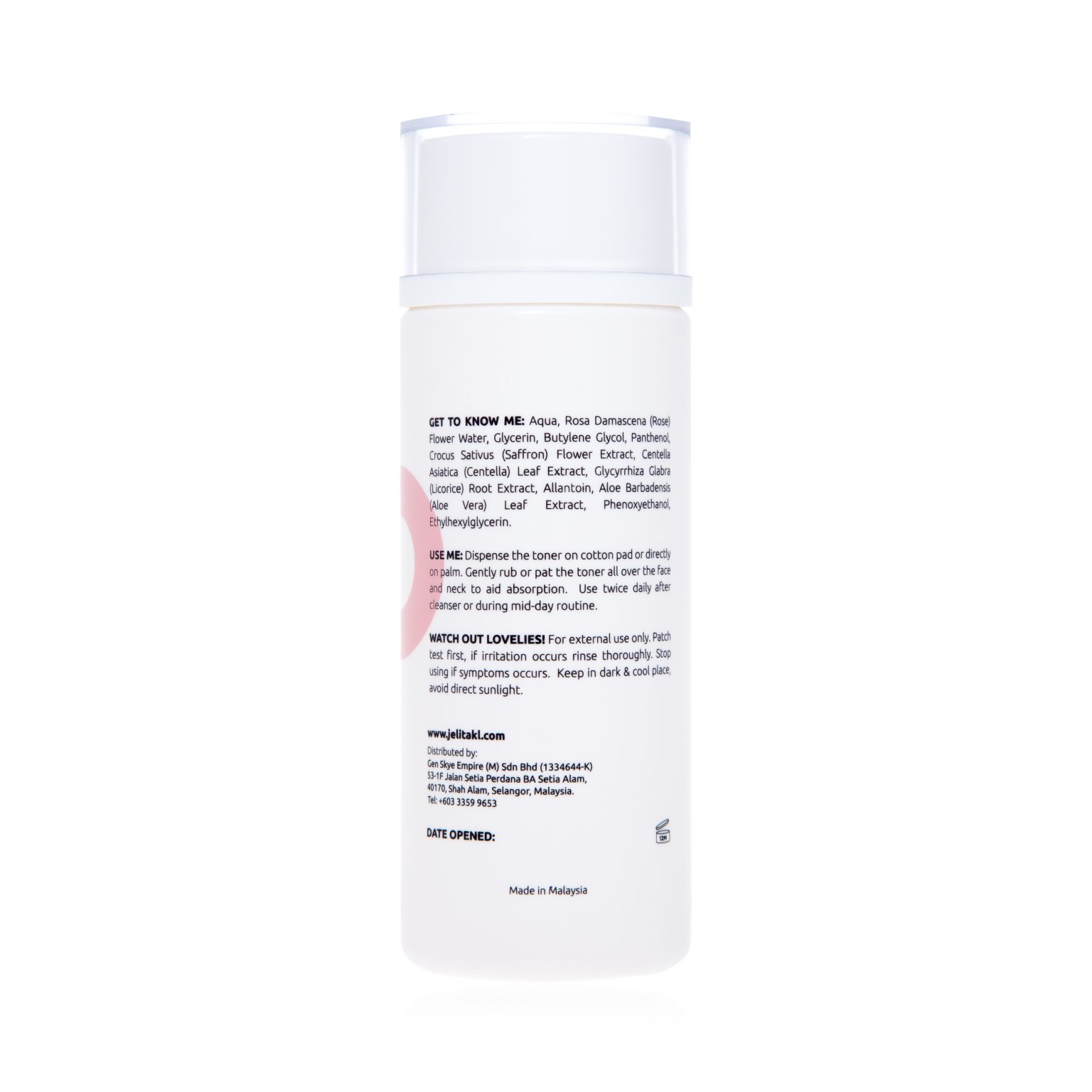 Aqua, Rosa Damascena (Rose) Flower Water, Glycerin, Butylene Glycol, Panthenol, Crocus Sativus (Saffron) Flower Extract, Centella Asiatica (Centella) Leaf Extract, Glycyrrhiza Glabra (Licorice) Root Extract, Allantoin, Aloe Barbadensis (Aloe Vera) Leaf Extract, Phenoxyethanol, Ethylhexylglycerin