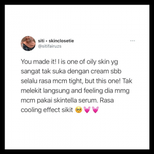 Skintella Moisturizing Gel is a lightweight moisturizer with a texture that strikes the balance between gel and cream. Enriched with Centella Asiatica extract, Ceramide, Beta Glucan, Squalane, and Cholesterol, this moisturizer soothes the skin while providing enough moisture to assist in skin barrier repair, by restoring the natural compound of the skin.